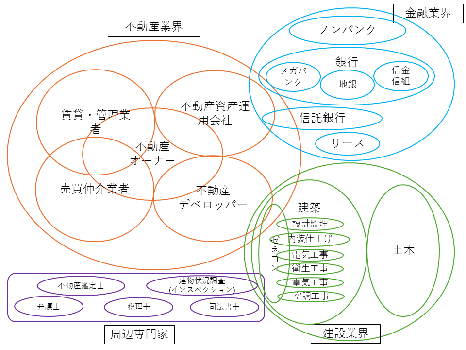 まず最初に、不動産業界について解説する。不動産業界は、不動産オーナー、不動産デベロッパー、賃貸・管理業者、売買仲介業者、不動産資産運用会社などのプレーヤーで構成される。不動産業界に隣接する業界として、建設業界と金融業界が挙げられる。建設業界は、建築と土木に分類でき、さらにそれぞれの工事分野で、専門化・細分化がなされている。金融業界は、規模や機能に応じて、メガバンク、地銀、信金信組、信託銀行などに分類される。上記分類を筆者なりに大胆に業界地図として落とし込むと、以下のようになりる。