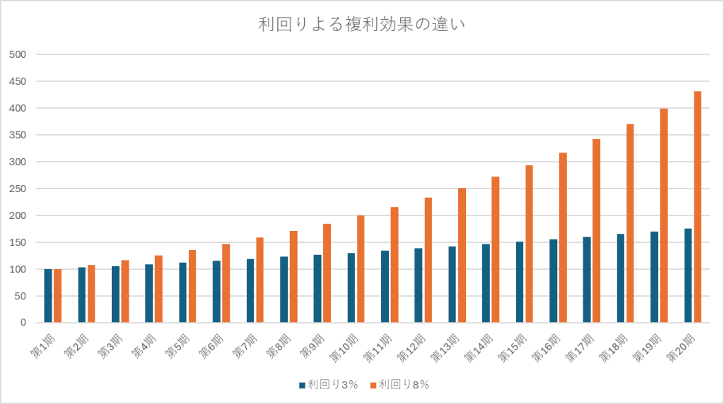 例えば、都心区分マンションを賃貸して得られる投資利回りが3%だと仮定し、一方、郊外もしくは地方の戸建を賃貸して得られる投資利回りを8%であると仮定する。得られた利益を同じ投資対象に20年間投資する場合、その資産がどれぐらい増えるのかを比較すると、いかのようになる。